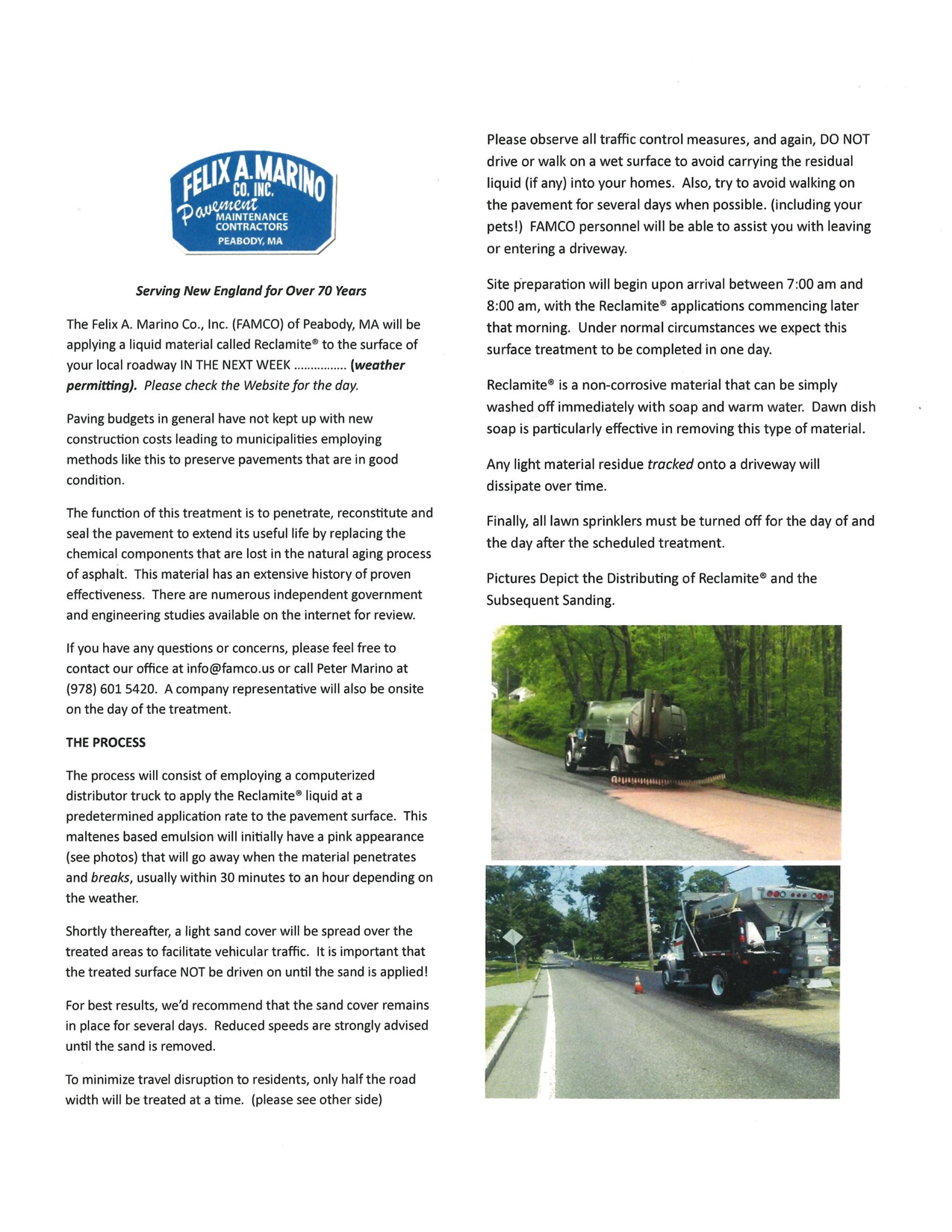 From July 14 to approximately July 18, 2025, weather permitting, Felix A. Marino will begin Phase 2 of the 2024 Rejuvenator Fog Seal treatment to these roads: Ph 2 Rejuvenator Rd List
